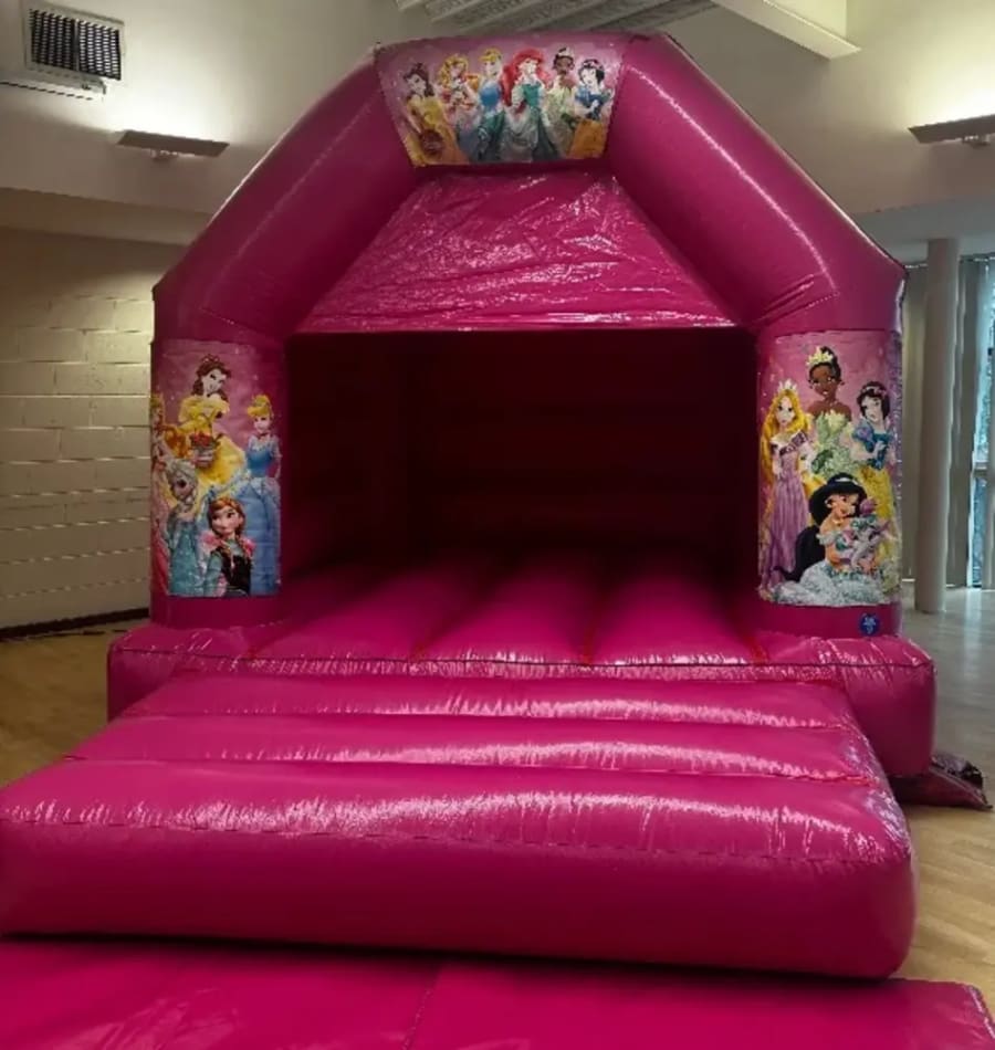 12ft wide x 14ft long x 10.6ft high Glossy pink princess themed bouncy castle Please check the measurements before booking £10 non refundable booking fee